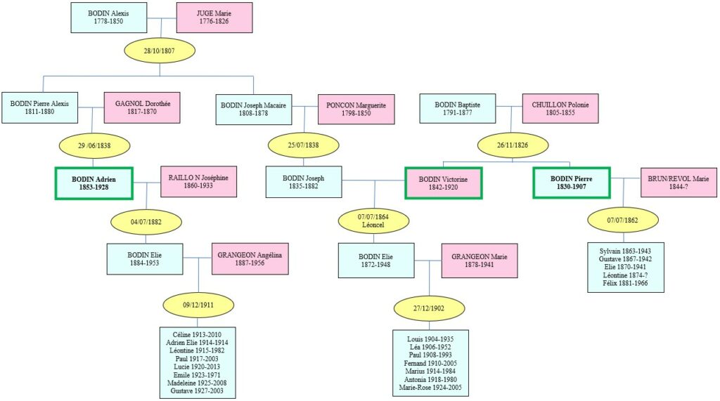Malgré une population de 375 habitants à cette époque, bien plus importante qu’aujourd’hui (46 habitants), seulement 4 familles portaient le nom de Bodin à Léoncel en 1884, ce qui a facilité l’analyse.