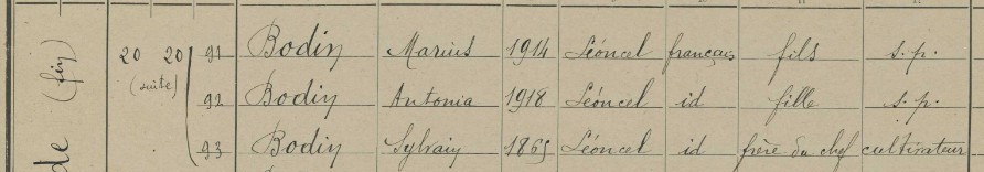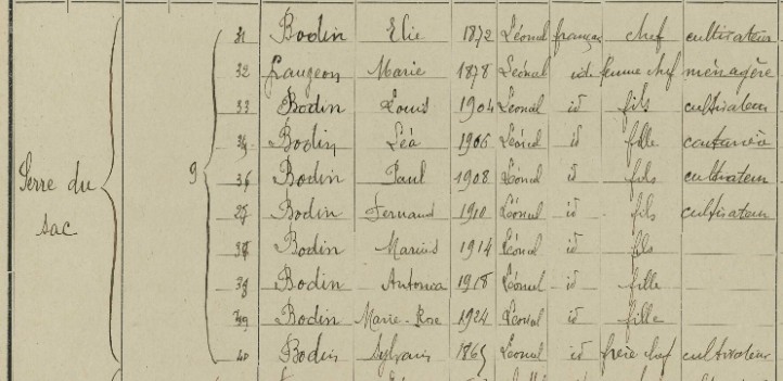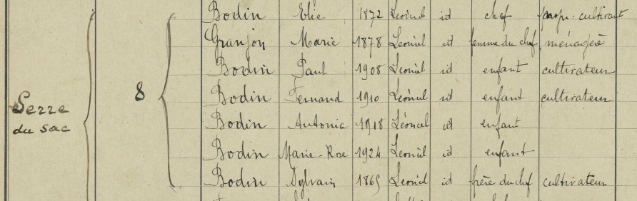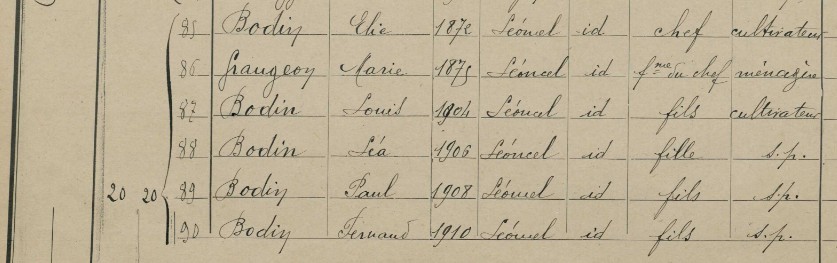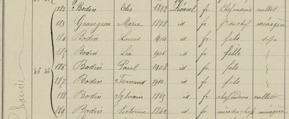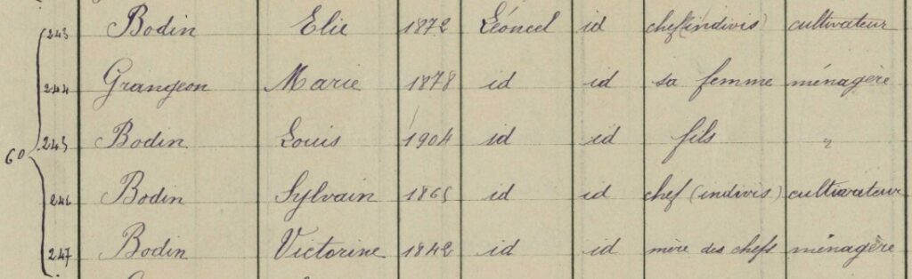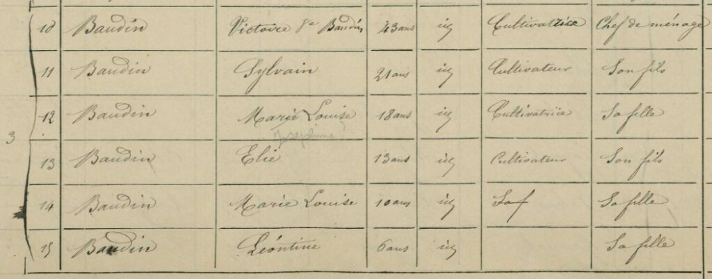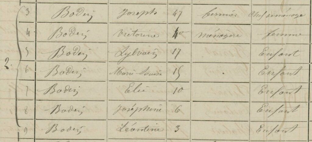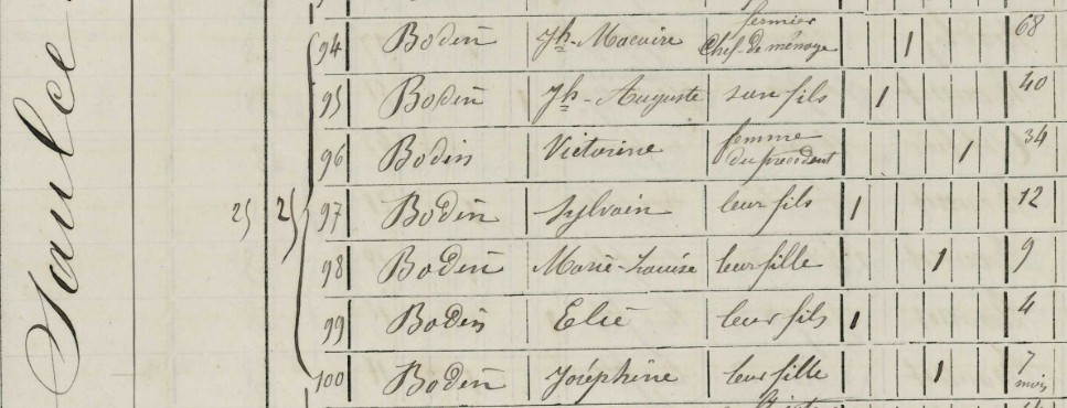 On constate que lors de ce recensement, le nom Bodin s’est transformé en Baudin et qu’il y a une erreur sur le prénom d’un des enfants !